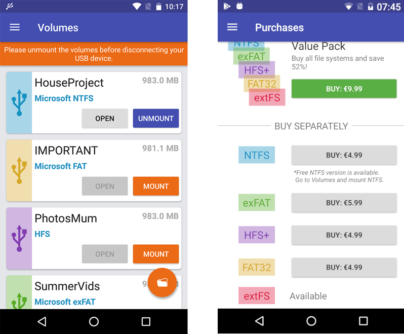Microsoft exFAT/NTFS für USB von Paragon Software verschafft Android-Geräten Zugriff auf USB-Speichergeräte mit einem der gängigen Dateisysteme von Microsoft Windows/macOS/Linux (HFS+, NTFS, exFAT, FAT32, extFS).