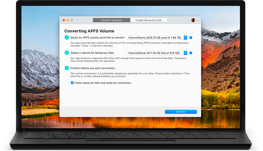 APFS to HFS+ Converter by Paragon Software easily reverts to the old good HFS+ for your specific scenarios. Create recovery media to boot up your Mac and then convert the system volume.